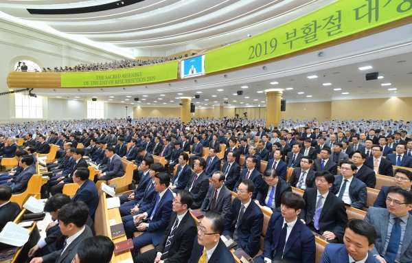 지난 18일 하나님의 교회 본당인 새 예루살렘 판교성전에서 열린 2019년 유월절 대성회에서는 성찬예식에 앞서 세족(洗足) 예식이 진행됐고 이어진 성찬예배에서 총회장 김주철 목사는 “십자가 고난을 앞두신 예수님께서 제자들에게 ‘너희와 함께 유월절 먹기를 원하고 원하였다’ 하시며 ‘이를 행하라’고 분부하셨다”고 강조했다.
