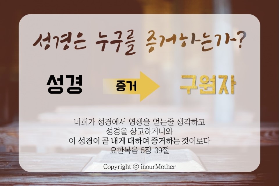 성경은 누구를 증거하고 있을까요? 성경은 인류를 구원할 구원자를 증거하는 책입니다. 우리를 구원하러 이 땅에 오시는 구원자는 오직 성경을 통해서만 발견하고 영접할 수 있습니다.