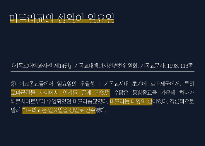 이러한 미트라교의 영향으로 당시 많은 로마인들은 일요일을 성일로 생각하였습니다.