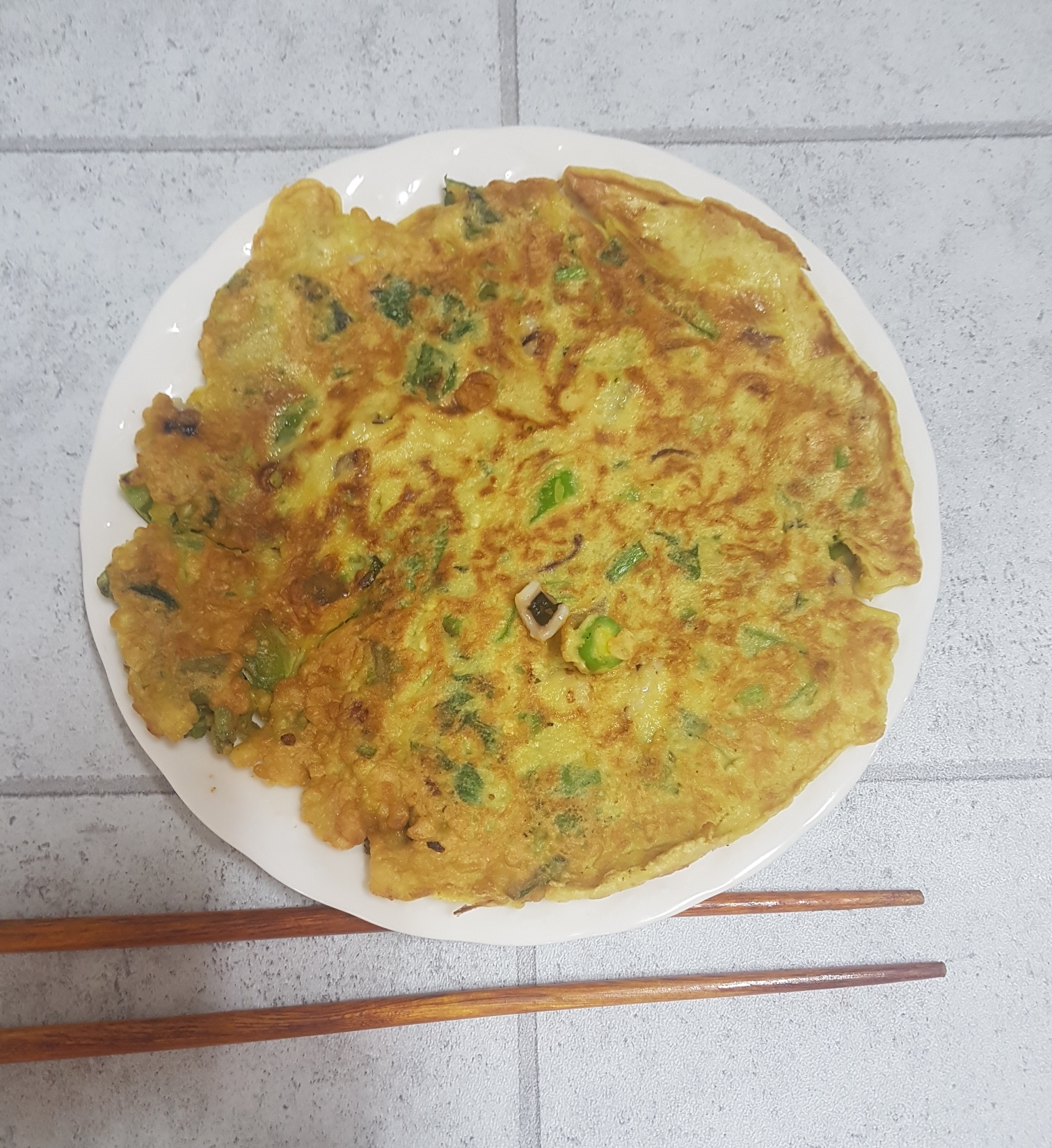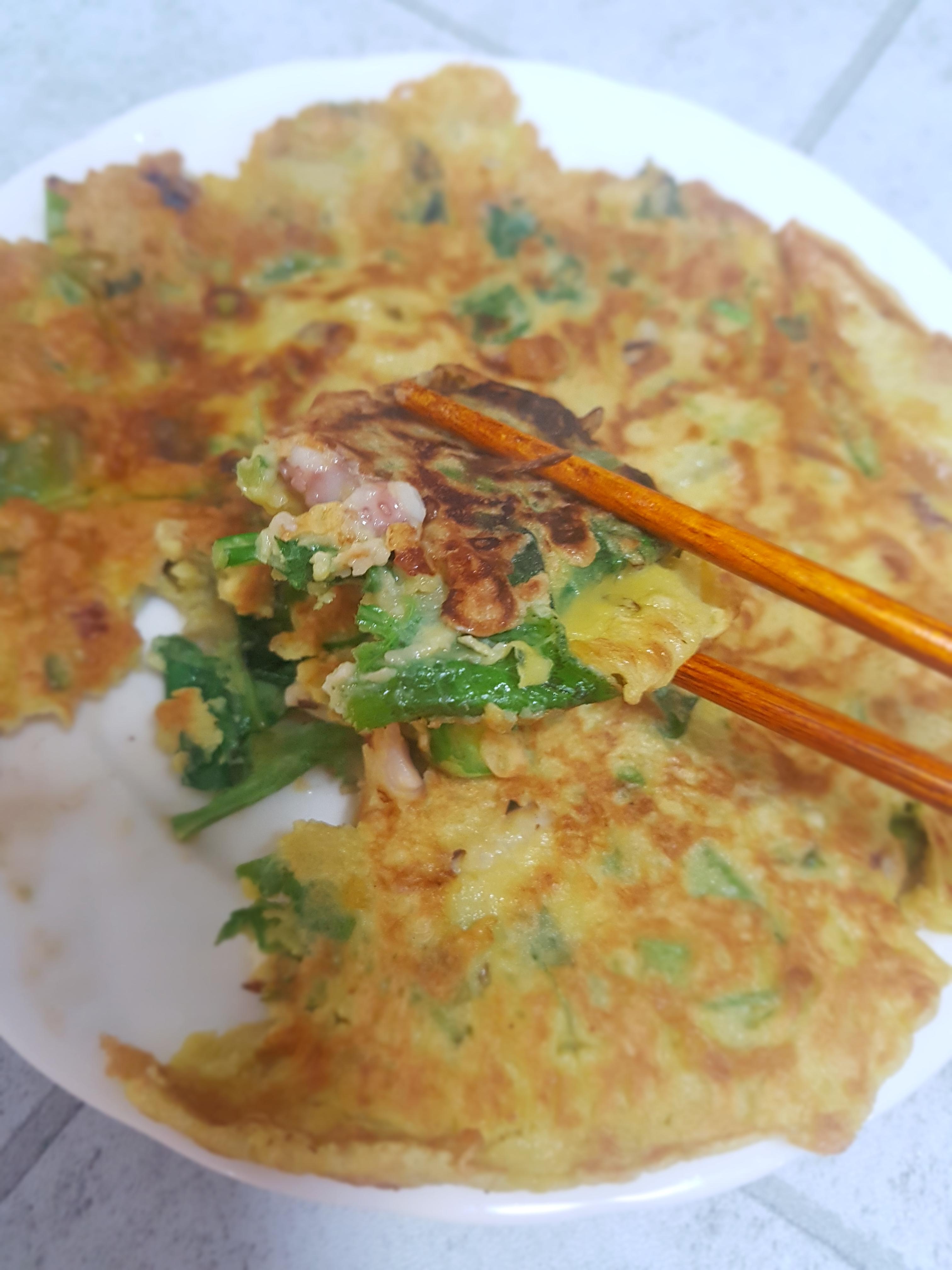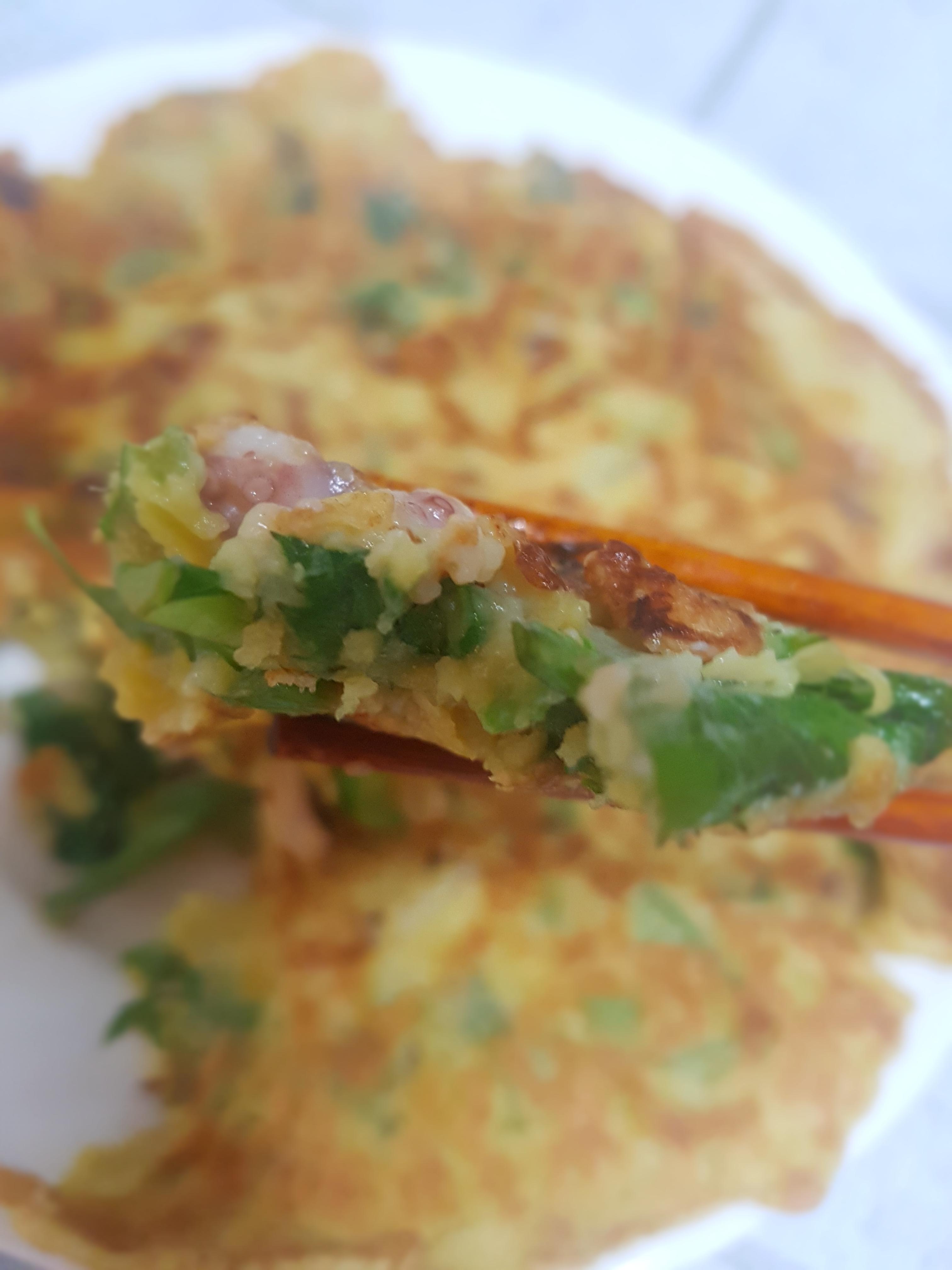 후라이팬에 기름을 두르고 이제 맛있게 부쳐주면,맛있는 낙지취나물 부침개 완성~♡