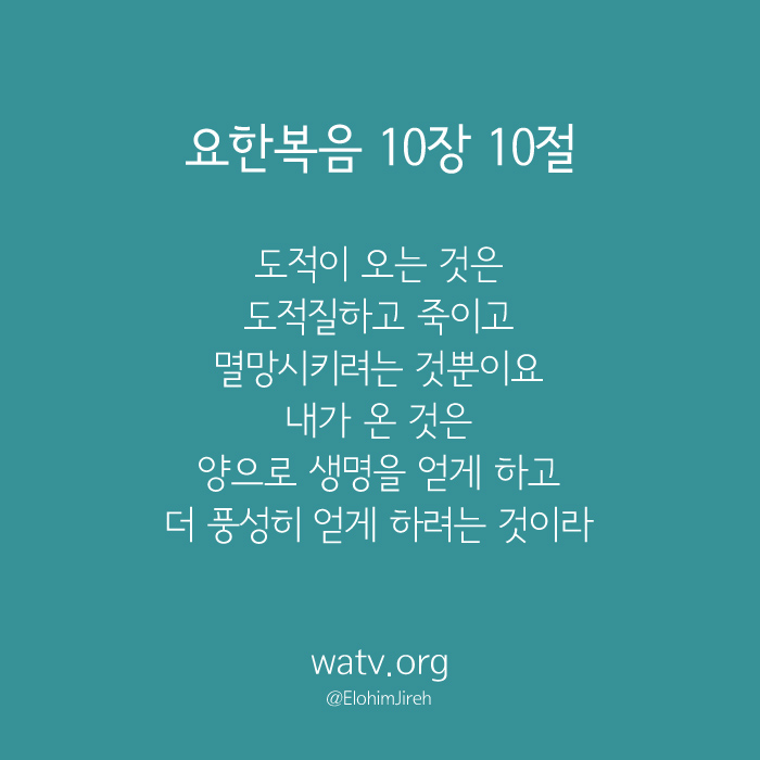 요한복음 10장10절 도적이 오는 것은 도적질하고 죽이고 멸망시키려는 것뿐이요 내가 온 것은 양으로 생명을 얻게 하고 더 풍성히 얻게 하려는 것이라