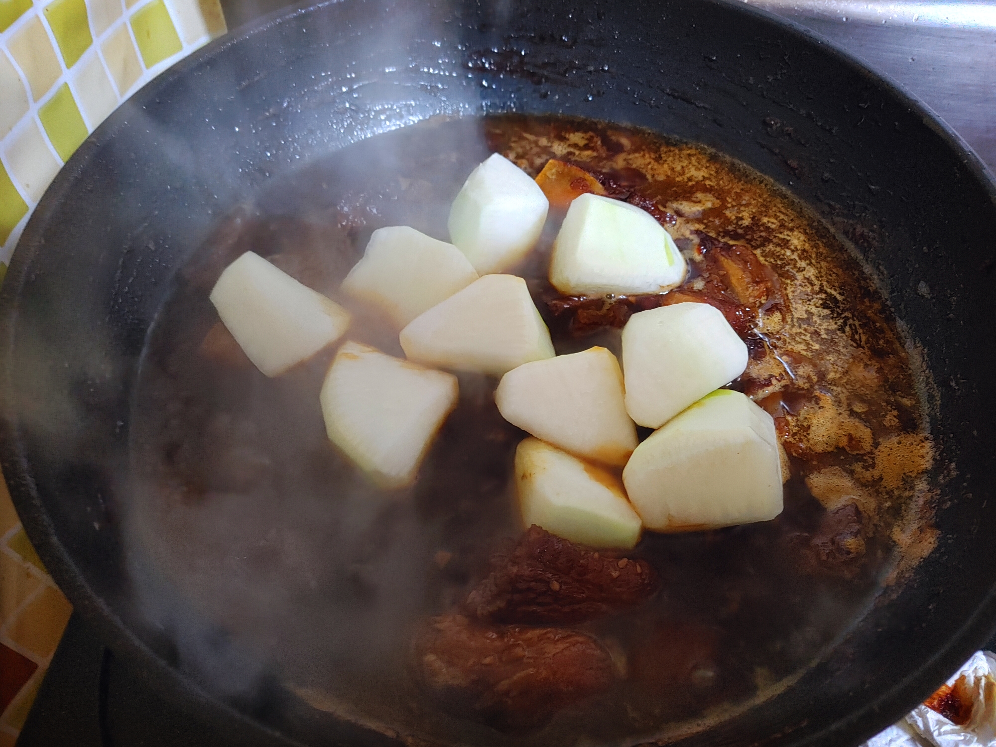 이제 야채를 넣어주면 되는데 순서가 있어요~ 가장 먼저 무를 넣고