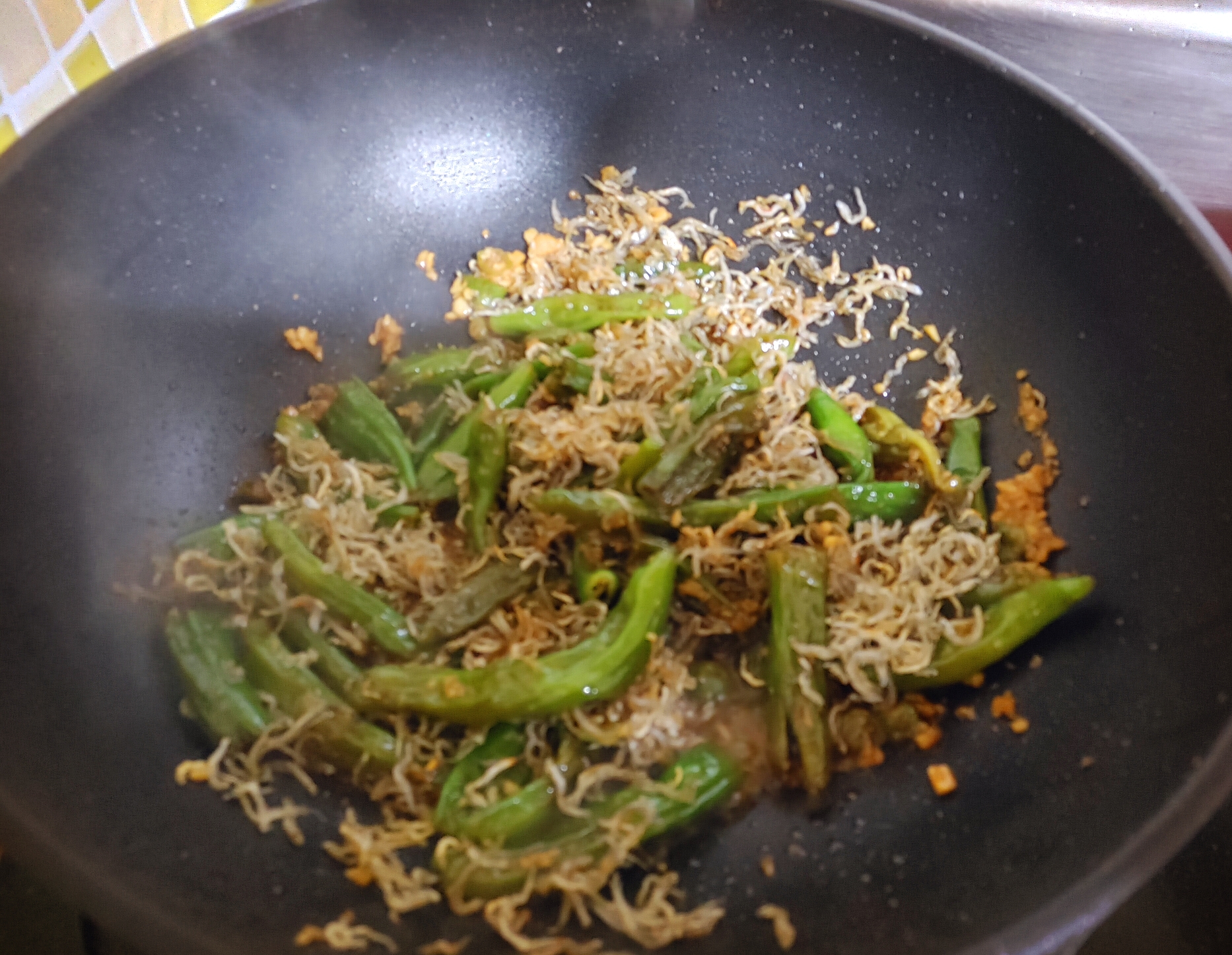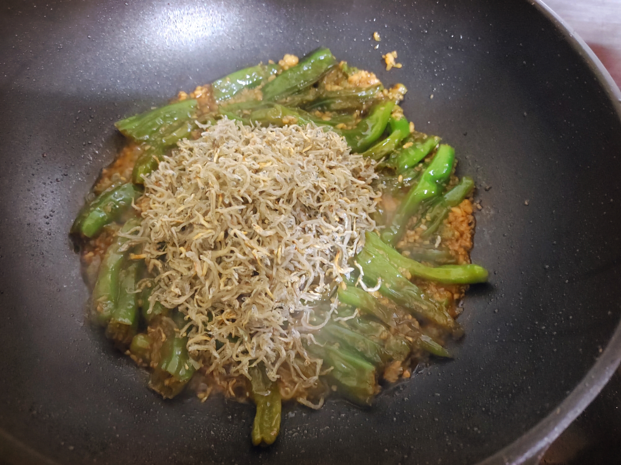 고추가 다 익었음 멸치를 넣어주세요. 멸치는 중간정도 크기가 좋다고 하는데 울집에는 잔멸치뿐이라 이걸로 했어요~~