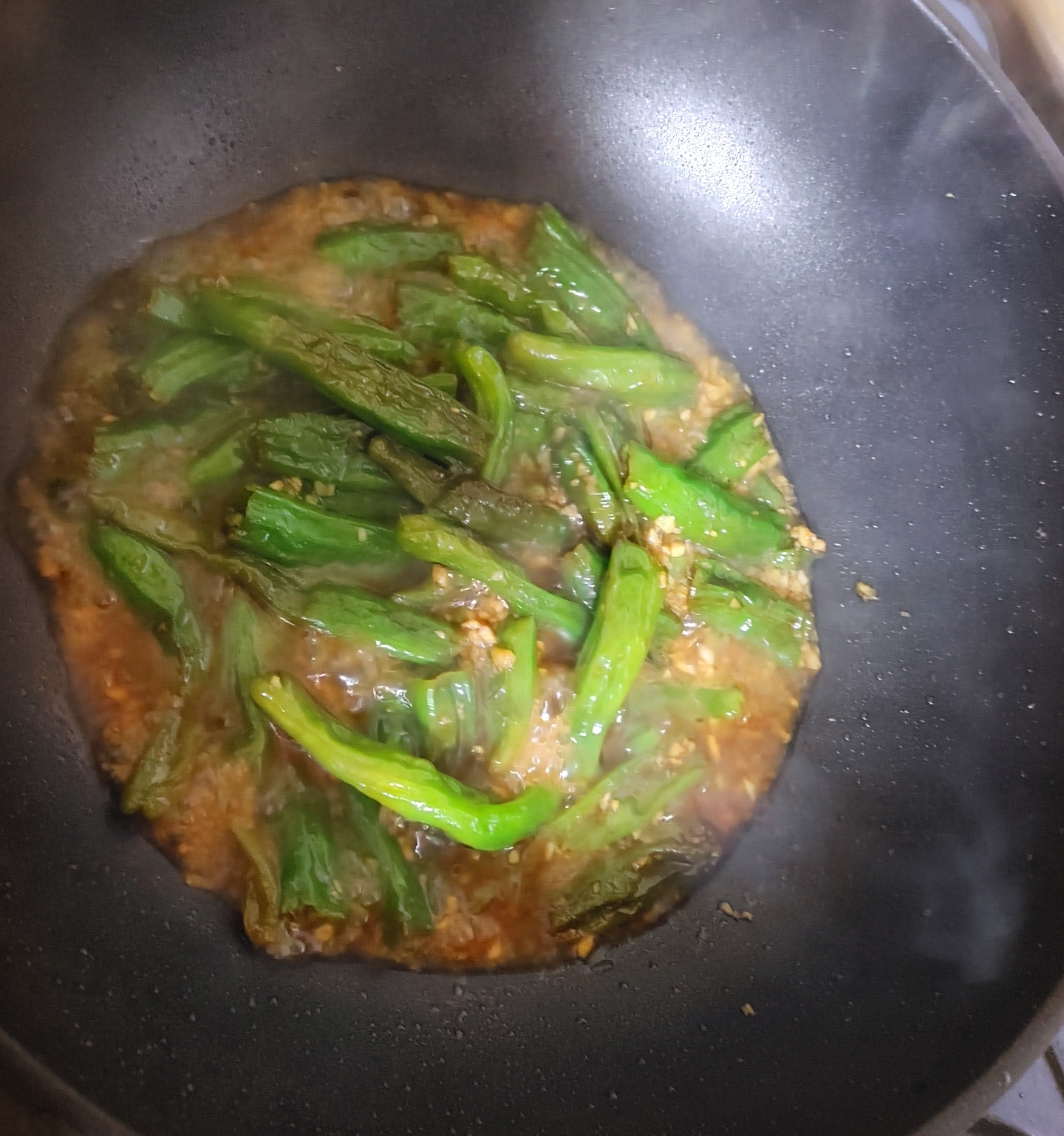 깊은 웍에 식용유를 두르고 먼저 고추에 다진마늘이랑 설탕을 넣고 볶아주세요~ 반정도 익힌 후 불을 끄고 진간장3큰술, 국간장2큰술 그리고 물한컵 부어 뚜껑 닫고 푹 익혀주시면 되요~
