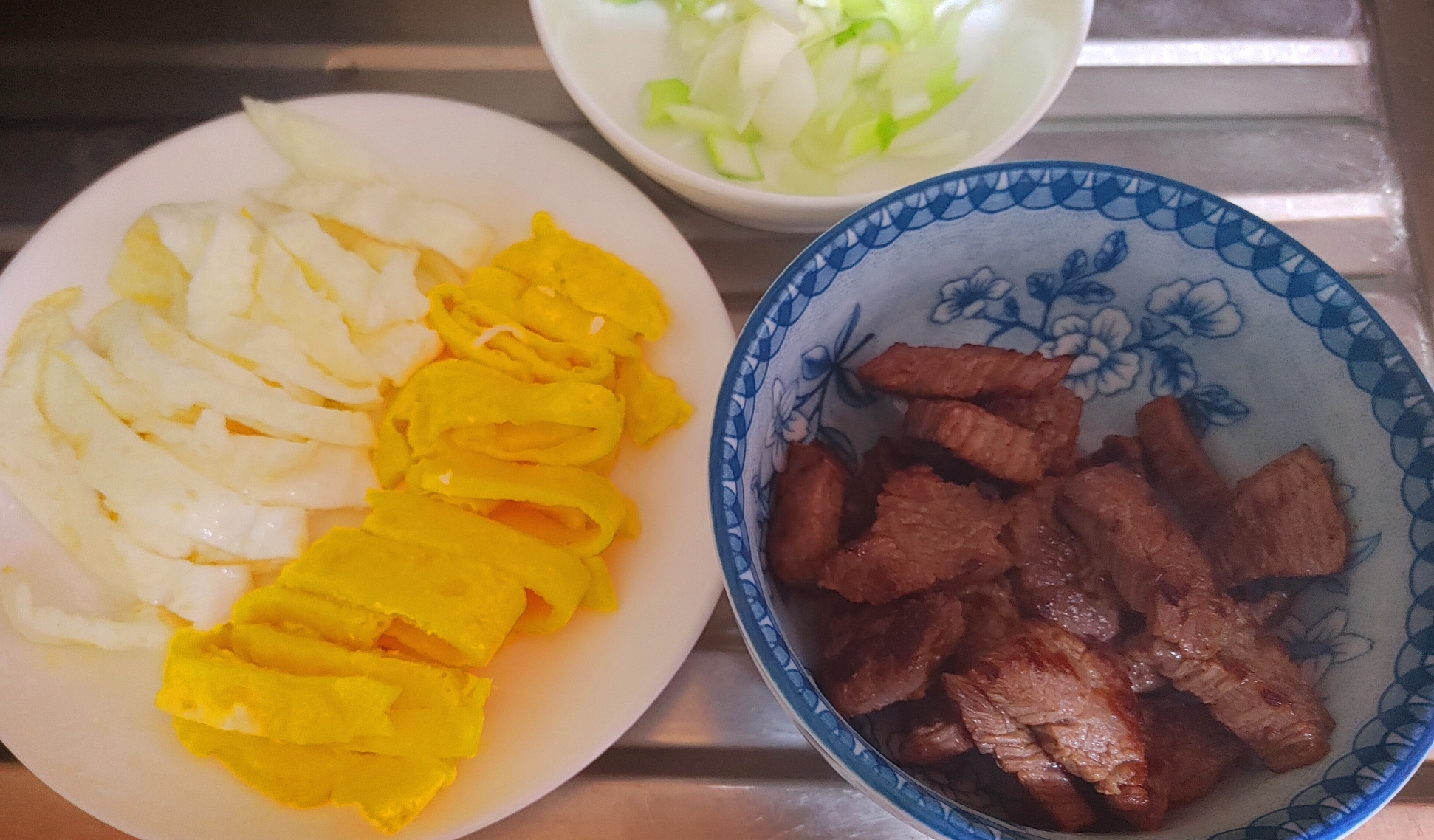 계란지단도 노른자랑 흰자 분리해서 따로 부쳐 만들어두고 한우도 큼직하게 ㅋ 구워서 준비해뒀어요~ 김은 깜박했는데 ㅋ 파만 있어도 괜찮더라구요~~ㅋ