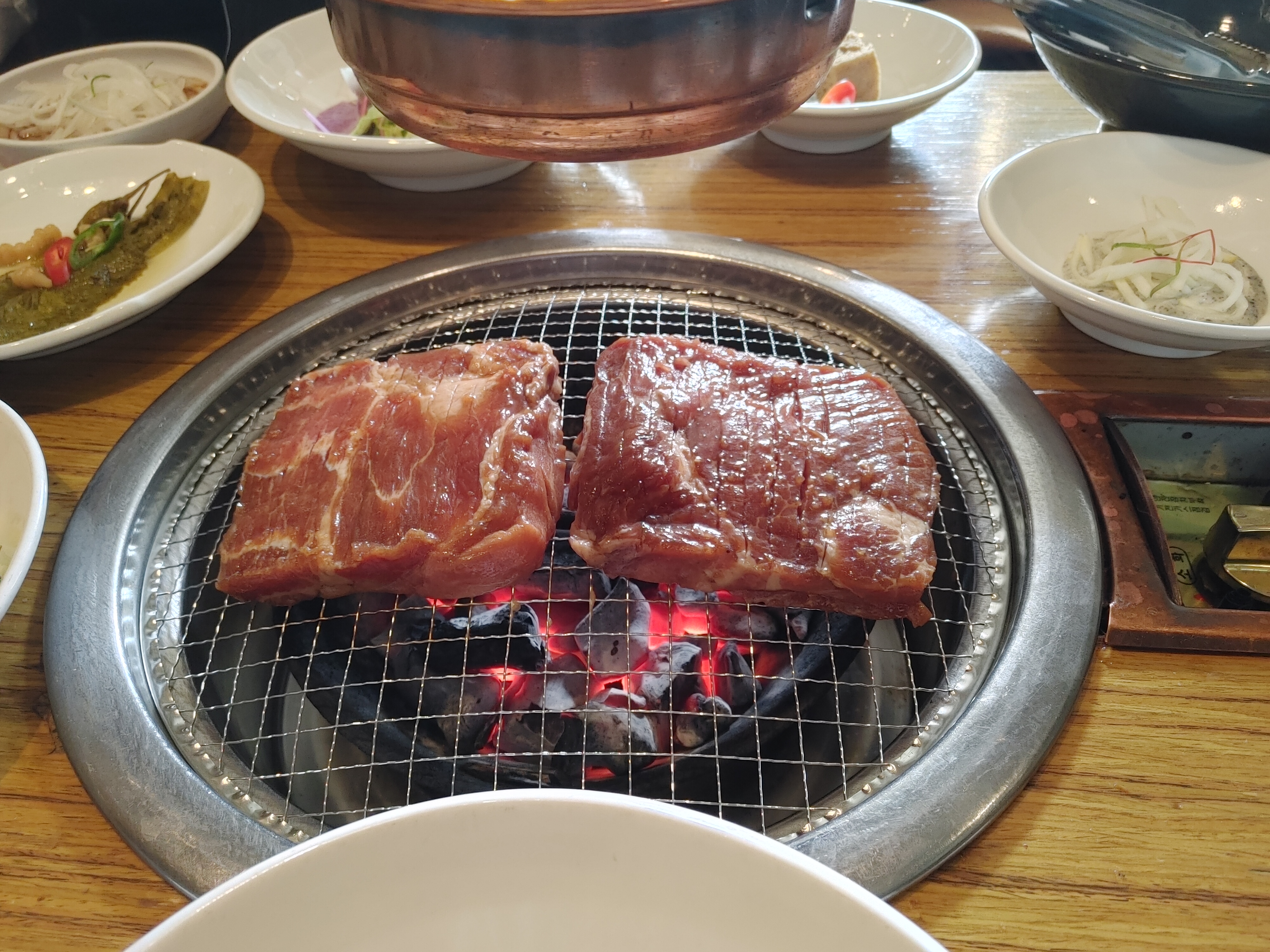 직원분께서 구워주시더라구요~ 굽고 바로 찍었어야 했는데 다들 배가 고파 빨리먹다보니 불판이 휑하네요 ㅋㅋ 야들야들 달콤 맛있었어요~