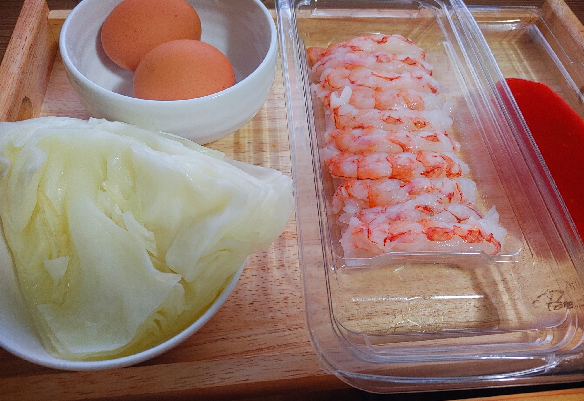 오늘 저의 저녁 메뉴는 이마트에서 사온 홍새우랑 삶은 계란 1개, 참치 반캔, 삶은 양배추