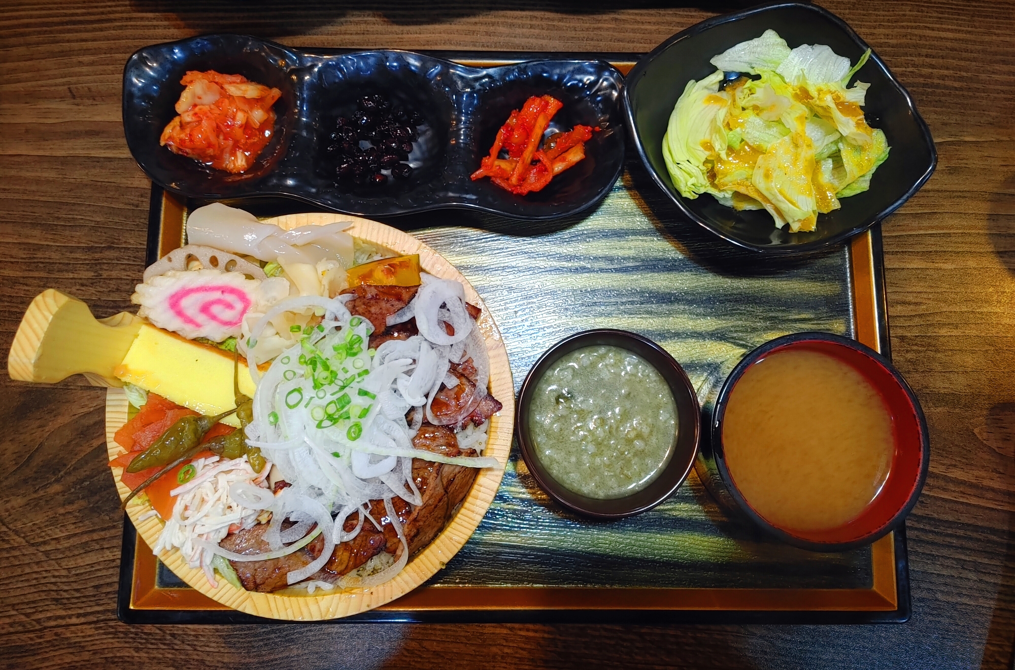 매생이죽, 샐러드, 미소된장국, 무말랭이, 김치, 콩자반 그리고 메인 스테이크 벤또