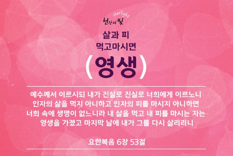 에덴동산에서는 생명과를 먹으면 영생한다고 했는데 예수님께서는 당신의 살과 피를 먹으면 영생한다고 하셨습니다.