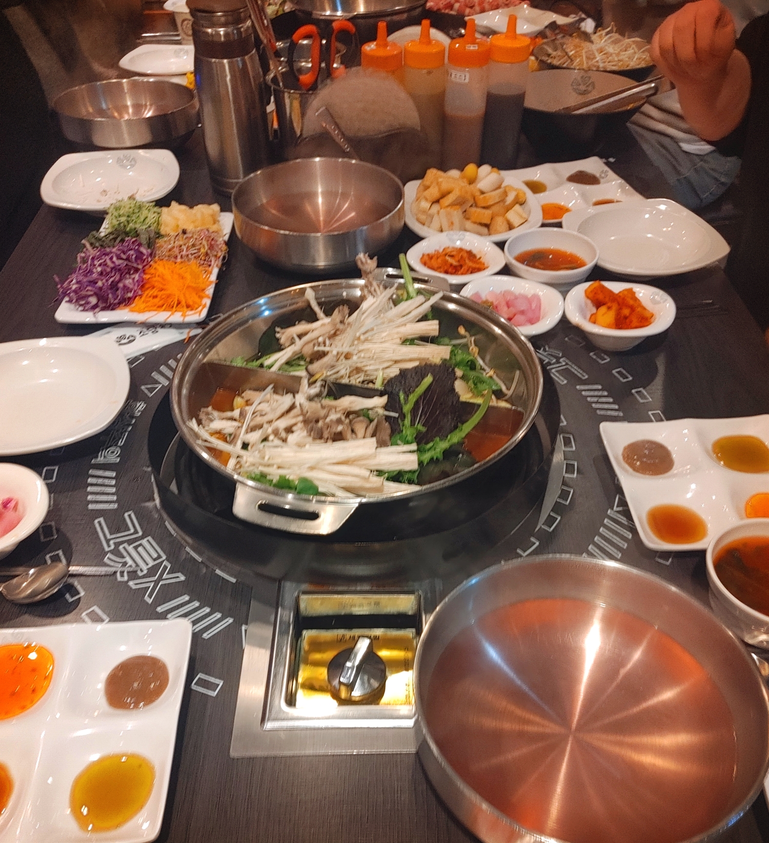 샤브샤브 재료들이 다양한데 팽이버섯, 느타리버섯,단호박,만두,떡,햄,유부 등등
