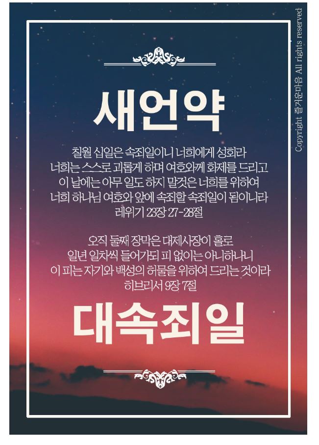 속죄는 '바칠 속', '허물 죄'자를 써서 죄를 없앤다는 의미이기에 대속죄일은 1년 동안 지은 죄를 하나님께서 용서받는 아주 중요한 날입니다. 히브리어로는 '욤 키푸르'라고 하며 욤은 날, 키푸리는 속죄라는 뜻입니다. 구약시대에 대속죄일은 대제사장이 지성소에 들어갈 수 있는 유일한 날이었습니다.